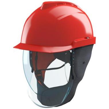 De helm is uitgerust met een ingebouwd helder polycarbonaat gelaatsscherm dat bescherming biedt tegen verschillende gevaren, waaronder stoten, chemische spatten, UV-straling en spatten van gesmolten metaal. Het gelaatsscherm is voorzien van een hoogwaardige anticondens- en kraswerende coating en is compatibel met correctie- en veiligheidsbrillen. De unieke verlengde oor- en nekflappen bieden extra bescherming tegen vlambogen tot 7kA.