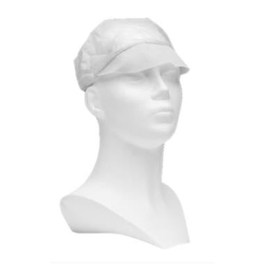 Deze witte pet met klep van non-woven polypropyleen is voorzien van een latexvrij elastiek aan de achterkant voor een comfortabele pasvorm. De hoofdbescherming is geschikt voor eenmalig gebruik en wordt geleverd in een verpakking van 100 stuks, wat deze pet ideaal maakt voor hygiënische toepassingen waar regelmatige vervanging gewenst is.