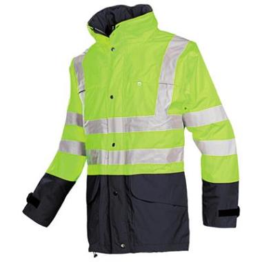 De Sioen 132Z Brighton jas is vervaardigd uit 100% polyester weefsel met cotton touch en voorzien van een 100% PU-laminaat (Siopor® Extra, 205 gr/m²). Deze waterafstotende jas heeft een vochtabsorberende coating aan de binnenkant en waterdicht getapete naden. De jas is uitgevoerd in fluo geel/marineblauw en beschikt over een rechtopstaande kraag, afneembare capuchon met kinbescherming en een ritssluiting onder dubbel beleg met drukknopen. De ruglengte bedraagt 85 cm (maat L).