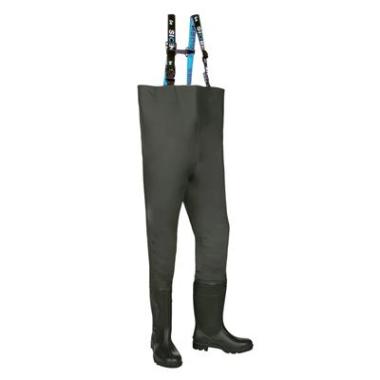 De waadbroek is uitgerust met praktische bretels met gespen voor een goede pasvorm en verstelbaarheid. De knieën zijn extra versterkt voor verhoogde duurzaamheid op kritieke punten. De geïntegreerde rubberlaarzen zijn specifiek ontworpen voor industrieel gebruik.